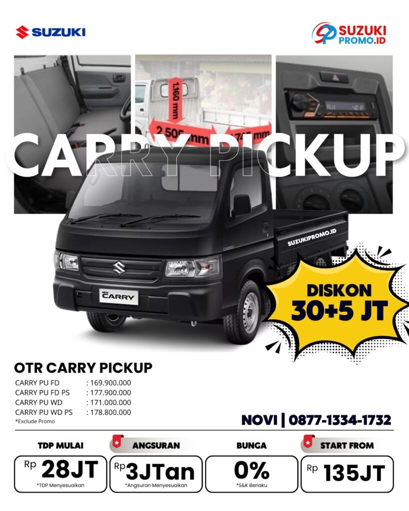 New Carry Pick Up kini dilengkapi dengan bak yang lebih luas dan sasis yang lebih kuat membuat kapasitas angkut hingga 1 ton. New Carry Pick Up hadir dalam varian wide deck dan flat deck yang lebih ekonomis dan dapat disesuaikan dengan bisnis Anda.